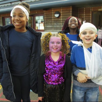 Each class also brought in 1p and 2p coins, our goal was to completely cover a lifesize picture of Pudsey Bear. See below some of our costumes and the start of our coin collection.