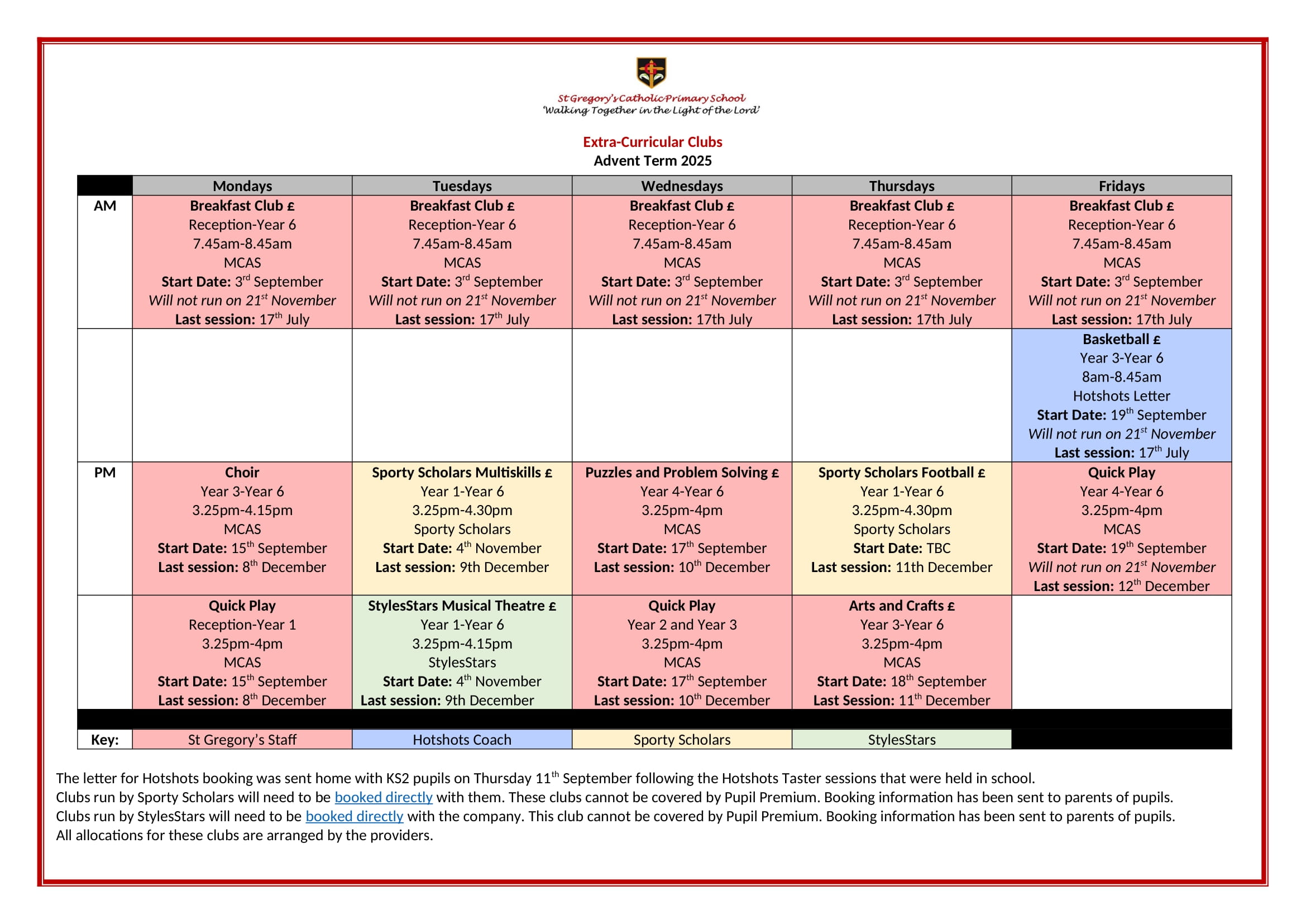 At St Gregory's Catholic Primary School, we are pleased to offer a wealth of extra-curricular clubs provided by our own staff, Hotshots, Pacesetter Sports and NTFC Community Trust. These take place before or after the school day.